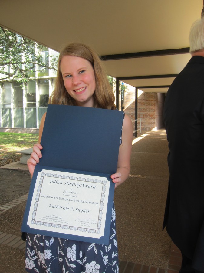 Our former Rice undergraduate Kate Snyder was awarded the Julian Huxley award (2012).